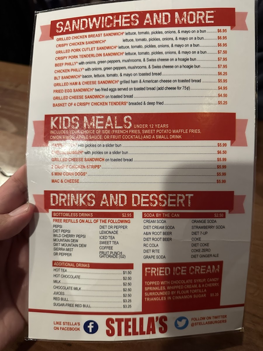 For those who lean toward specialty options, indulge in the Stella's Staple Burger, a decadent treat topped with cheese, crispy bacon, and a fried egg for just $7.50. Or try the Bacon & Blue Cheeseburger, where the bold flavors of blue cheese crumbles harmonize beautifully with smoky bacon—this mouthwatering creation is only $6.50. And let’s not forget the Swiss Mushroom Burger, featuring perfectly sautéed mushrooms and rich Swiss cheese that transforms every bite into a culinary delight.